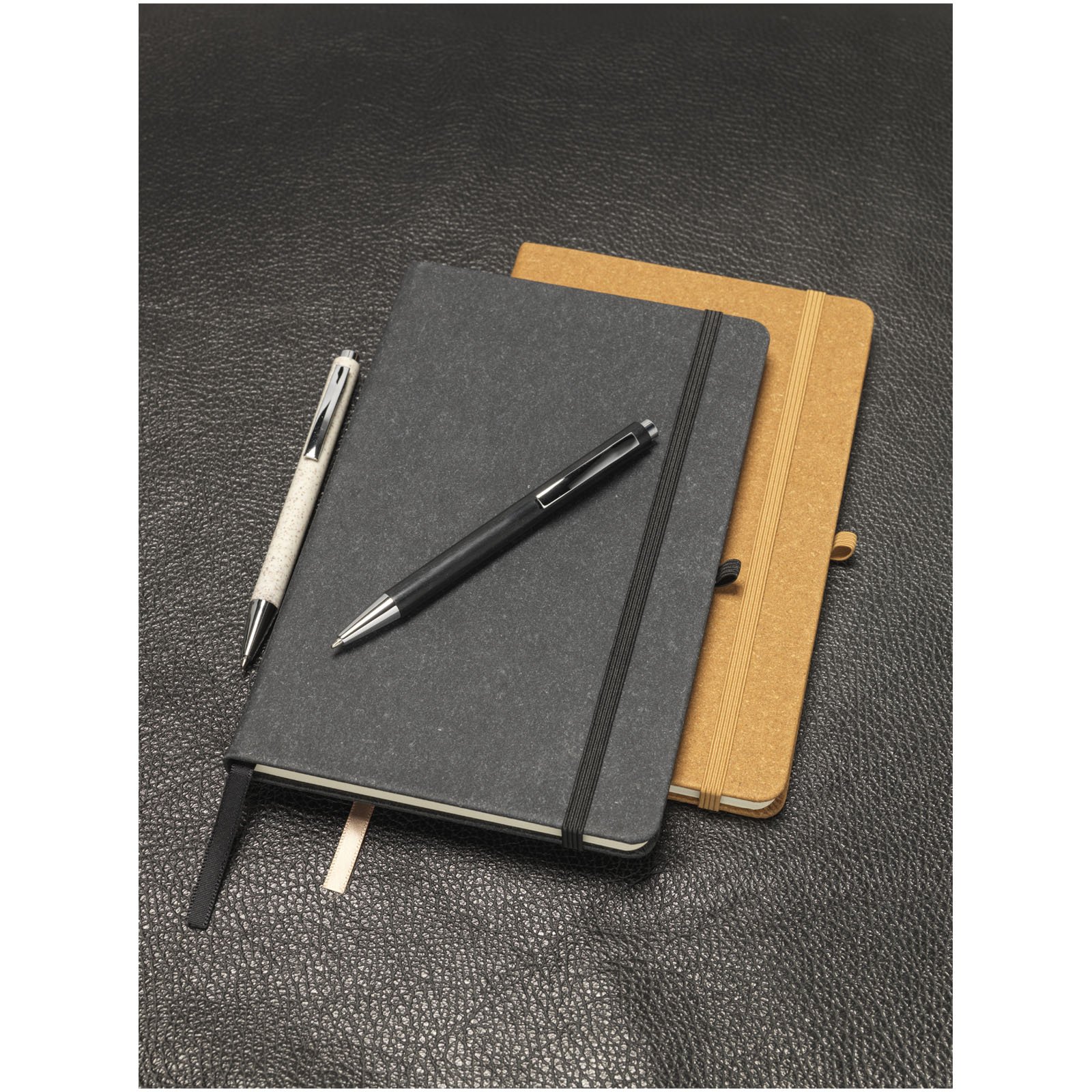 Cahier de référence format A5 avec couverture en chutes de cuir. Comprend une bande élastique, une boucle pour stylo, un marqueur à ruban et 80 feuilles de papier lignées de 80 g/m².