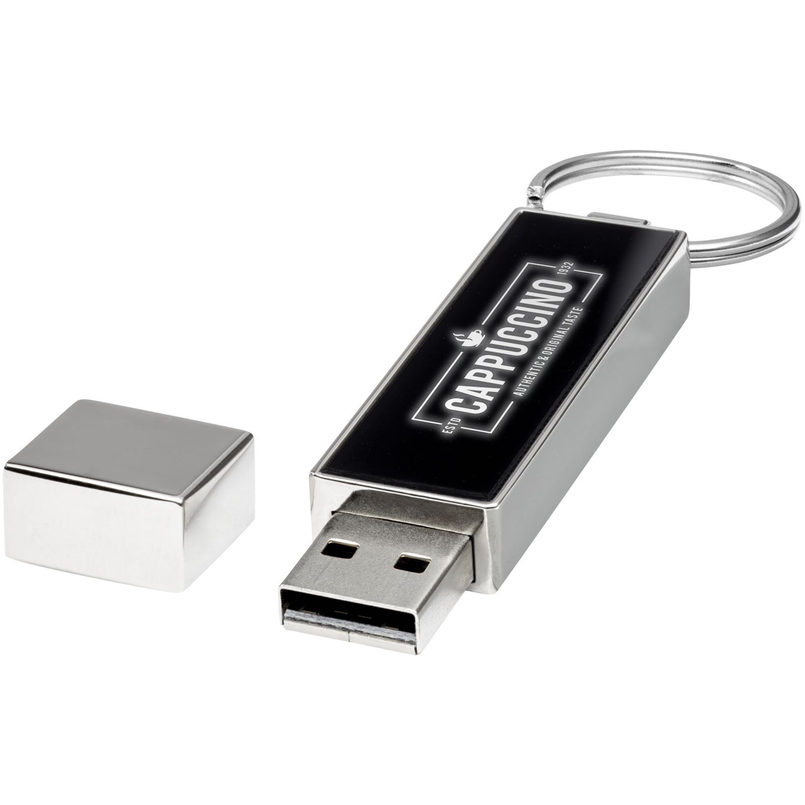 Clé USB rectangulaire avec effet logo lumineux saisissant (lumière blanche ou bleue). Disponible de 1 Go à 64 Go.