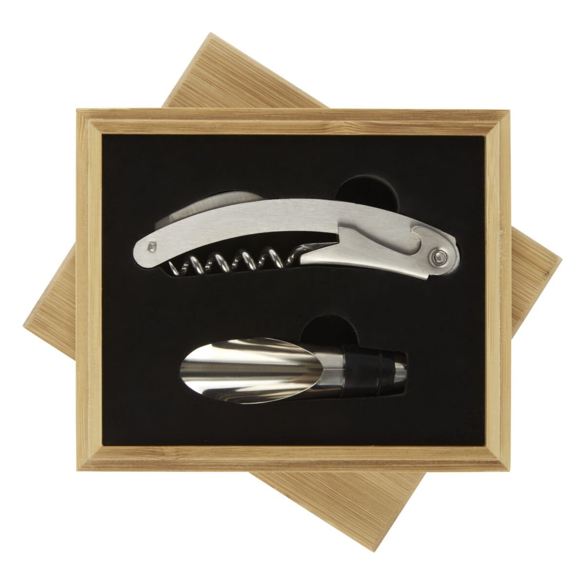 Coffret à vin 2 pièces comprenant un limonadier et un verseur pour bouteille. Livré dans un coffret cadeau en bambou et produit selon des normes durables.