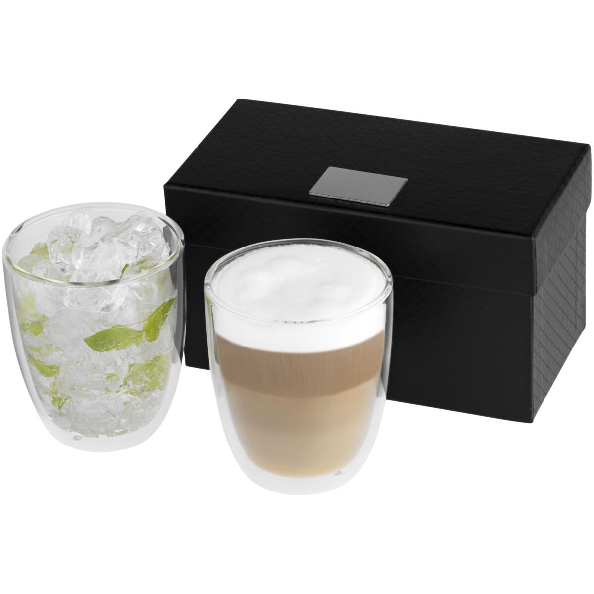Verres isothermes double paroi de 290 ml. Idéal pour servir votre latte macchiato favori, thé glacé ou des boissons chaudes ou froides. Présentation dans un coffret cadeau Seasons. Plaque logo incluse.