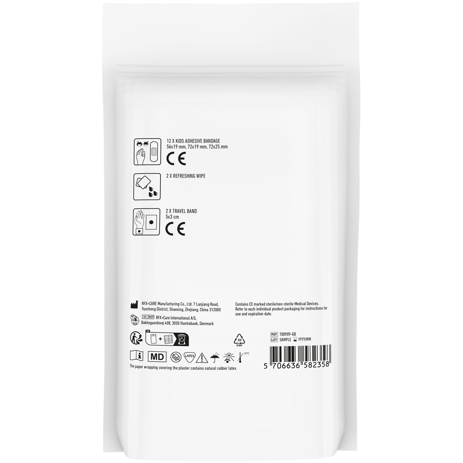 Ensemble de voyage pour enfant avec des articles de première nécessité pour les soins de base des plaies et des bracelets de voyage pour réduire les maladies liées aux voyages. Contenu : 12 pansements pour enfants, 2 lingettes rafraîchissantes et 2 bracelets de voyage. Tous les produits de premiers secours et de soin du kit répondent à toutes les réglementations européennes applicables. Le prix comprend le marquage sur toute la surface. Livrés dans une pochette en papier.