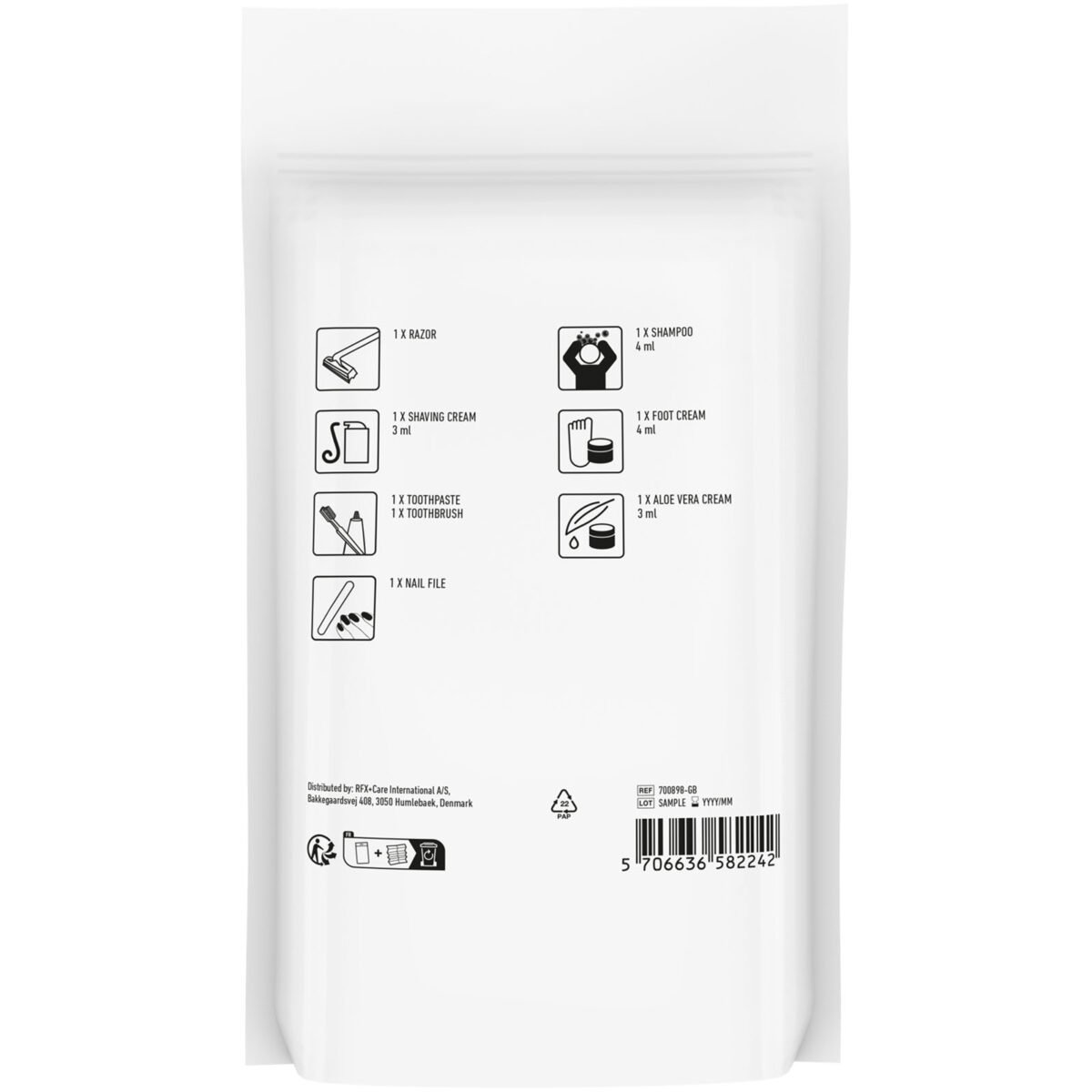 Kit d’hôtel avec toutes les nécessités pour les déplacements, idéal pour les voyages d’affaires ou les longues journées d’exposition. Contenu : 1 rasoir, 1 gel à raser, 1 crème à l’Aloe Vera, 1 shampooing, 1 gel pour les pieds, 1 lime à ongles, 1 brosse à dents et 1 dentifrice. Tous les produits de premiers secours et de soin du kit répondent à toutes les réglementations européennes applicables. Le prix comprend le marquage sur toute la surface. Livrés dans une pochette en papier.