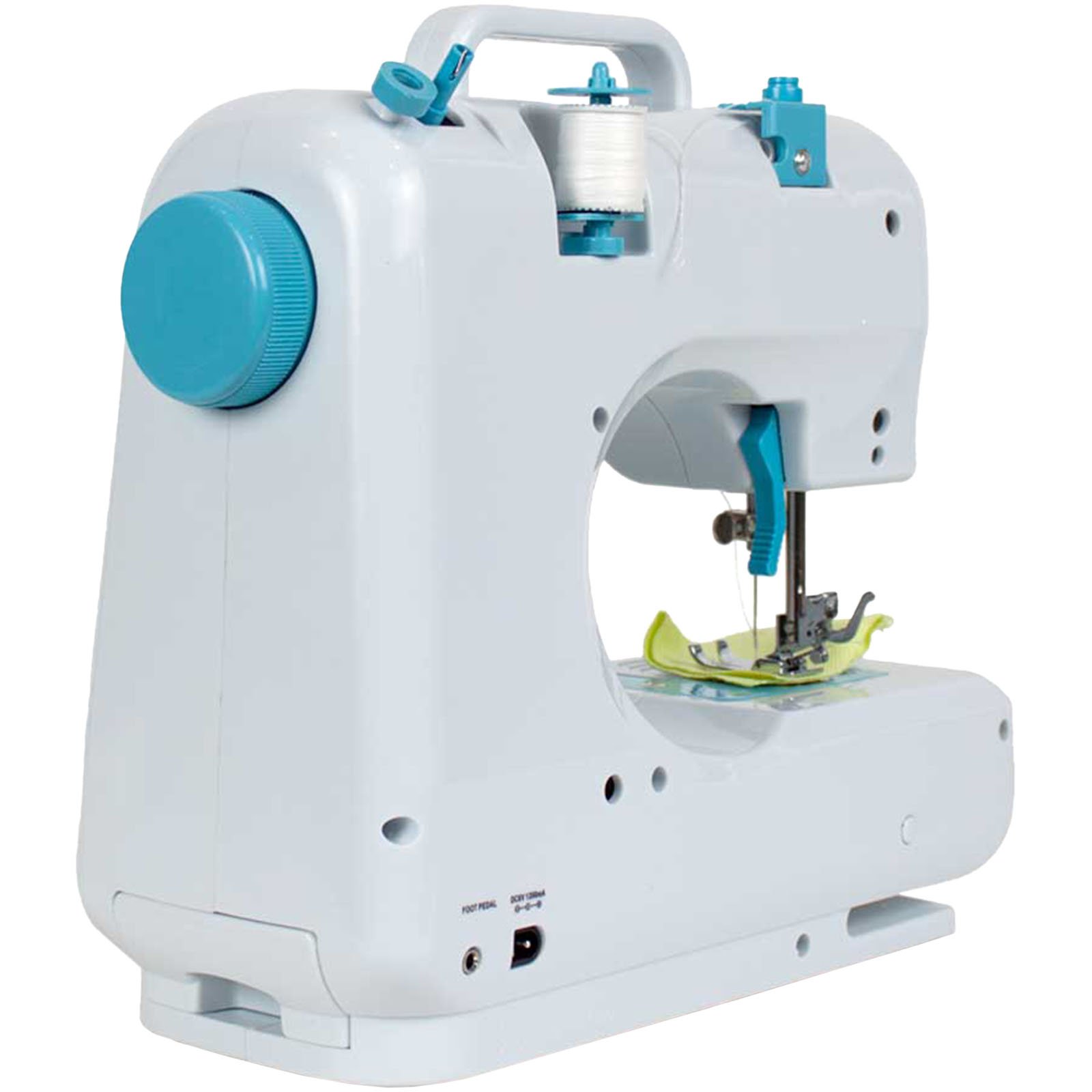 Machine à coudre avec 12 motifs de points intégrés. Tiroir intégré pour ranger les fils, aiguilles et autres outils. Légère pour améliorer la visibilité en cousant. Comprend une pédale et un adaptateur. Couture en marche avant et arrière. La machine est mise en marche par l’interrupteur manuel ou par la pédale. Elle peut être branchée sur une prise murale ou utilisée avec des batteries (4 x AA). Régulateur de tension. Cadran de sélection. Coupe-fil. Volant à bobine.