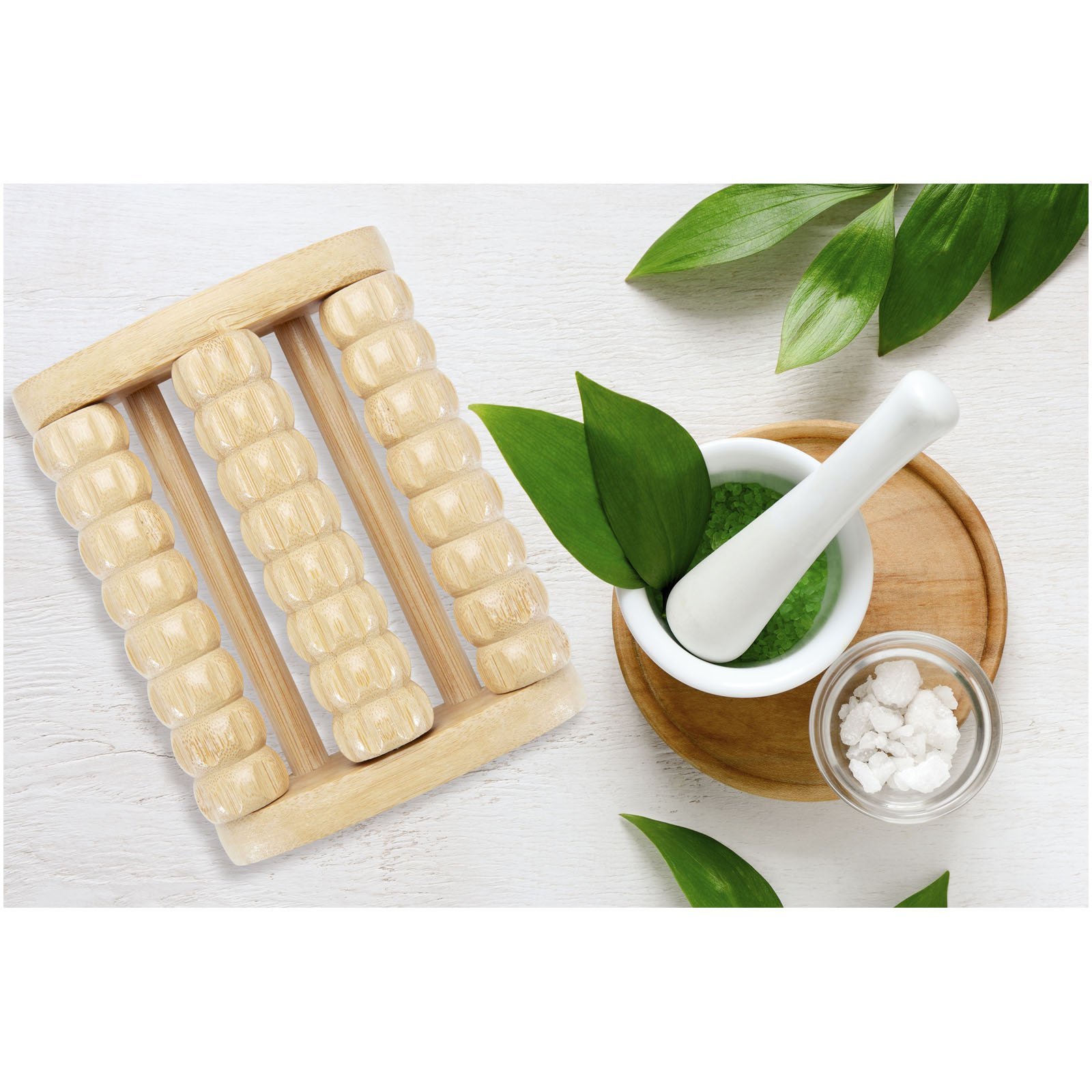 Rouleau de massage des pieds en bambou avec 3 rangées de tiges de massage et un revêtement anti-dérapant sur le fond. Il suffit de placer le masseur sur le sol, puis de déplacer vos pieds pour une agréable sensation de détente. Le bambou utilisé est sélectionné et produit selon des normes durables.