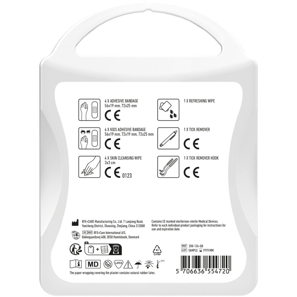 Le kit indispensable pour retirer les tiques et traiter leurs morsures. Contient:4 pansements, 4 cotons pour nettoyer la peau, 1 retire tique bleu (humains), 1 retire tique crochet (orange), 4 pansements pour enfants, 1 lingette rafraichissante. Tous les contenus à l’intérieur des kits sont conformes à la législation européenne. Le prix comprend l’étiquette personnalisée.