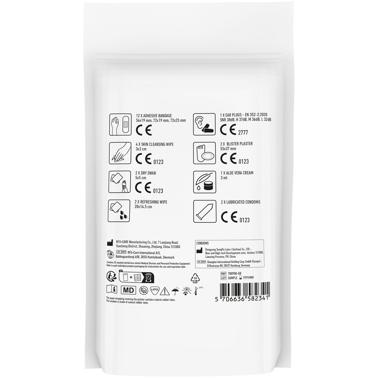Le kit pratique pour les festivals. Contient: 12 pansements, 4 cotons pour nettoyer la peau, 2 cotons secs, 2 lingettes rafraichissantes, 2 préservatifs, 2 pansements, 1 crème aloe vera, 2 bouchons anti bruit. Tous les contenus à l’intérieur des kits sont conformes à la législation européenne. Le prix comprend l’étiquette personnalisée. Livré en pochette papier.