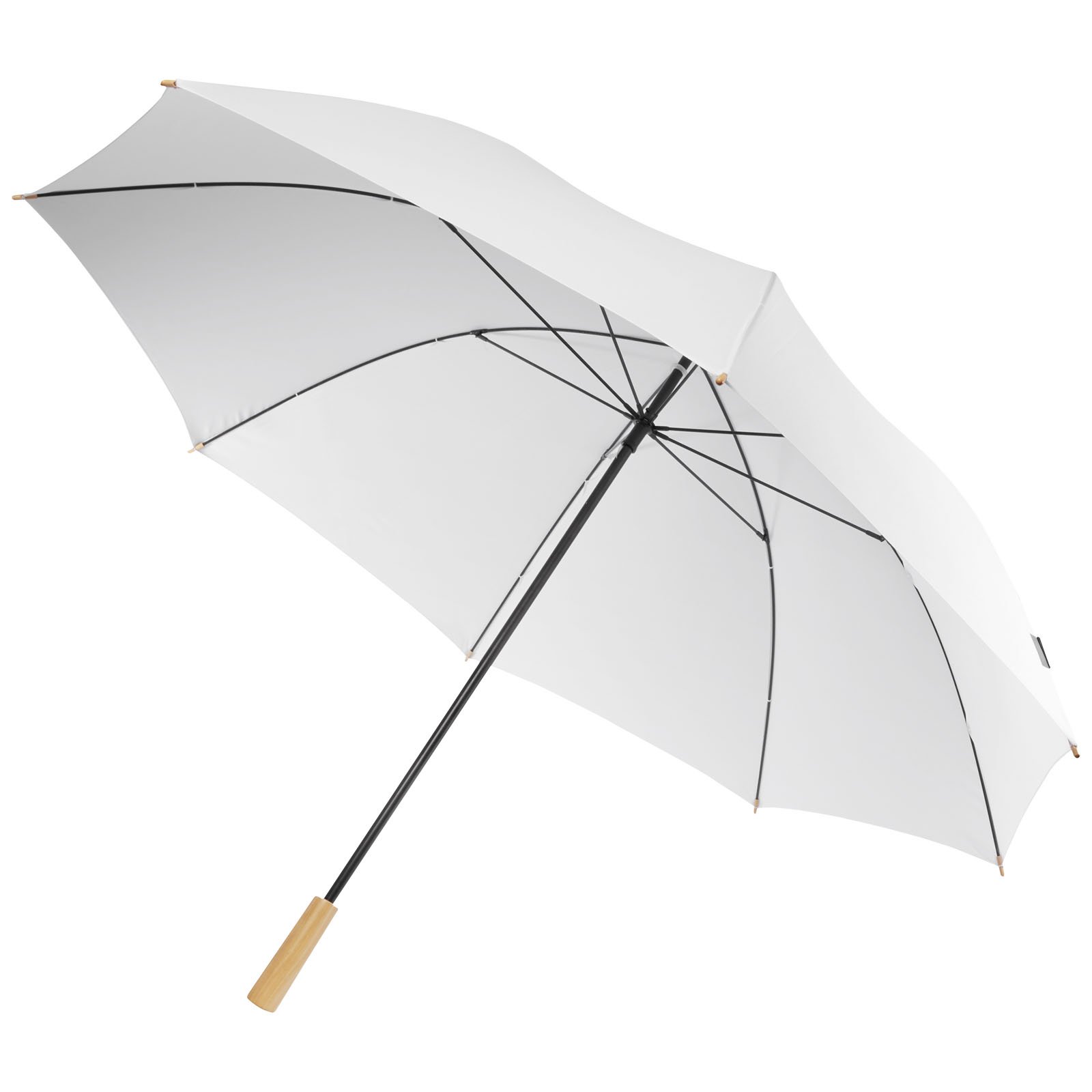 Parapluie de golf avec une toile en polyester pongee en PET recyclé convenant à 2 personnes. Le mat métallique robuste et le cadre de qualité supérieure avec des baleines en fibre de verre offrent un maximum de flexibilité dans des conditions venteuses. Avec la poignée en bois, les extrêmités et la toile en polyester pongee et PET recyclé, il offre un choix plus durable.