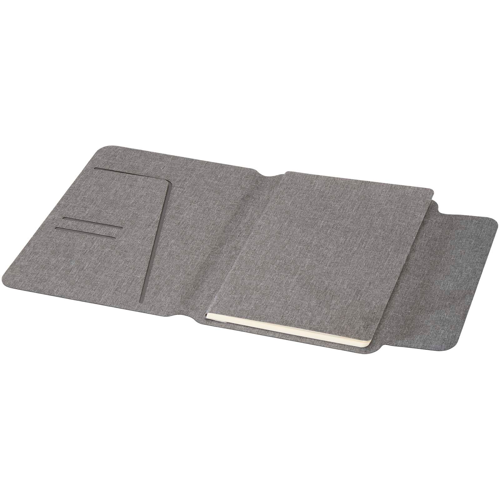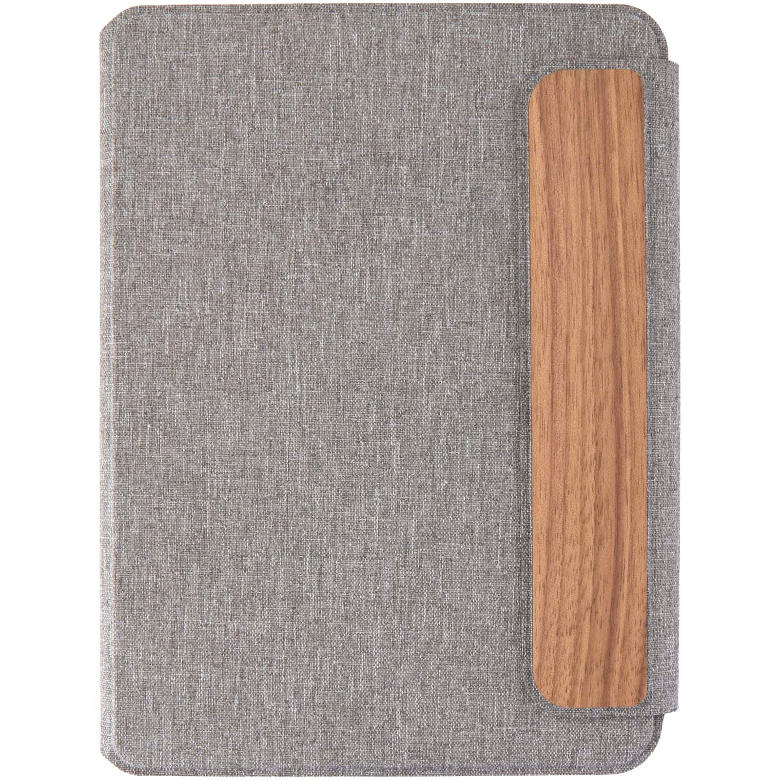 Le portfolio A5 Andean est en partie fabriqué à partir de polyester recyclé post-consommation certifié RCS, offrant une alternative plus durable en réduisant la dépendance aux matériaux vierges. Conçu avec une élégante couverture rigide grise aux coins arrondis et à la technologie de soudure de précision, il est sécurisé par une fermeture magnétique accentuée par un détail raffiné en bois de noyer, ajoutant une touche moderne et sophistiquée. À l’intérieur, vous trouverez un carnet à couverture souple amovible composé de 64 feuilles lignées de couleur crème, fabriquées à partir de papier 80 g/m² issu de sources responsables. Présenté dans une pochette en papier de couleur kraft.