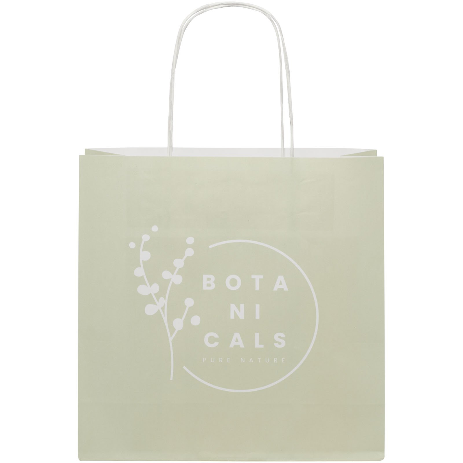 Petit sac en papier Kraft de 120 g/m2 (24 x 9 x 24 cm) avec poignées en papier torsadé. L’avant et l’arrière personnalisables offrent suffisamment d’espace pour l’impression d’un logo, ou de tout autre design, ce qui en fait un excellent outil de marketing commercial. Fabriqué en Europe et 100 % recyclable, ce sac est un choix plus durable pour les entreprises soucieuses de l’environnement et les particuliers à la recherche d’une solution d’emballage durable.