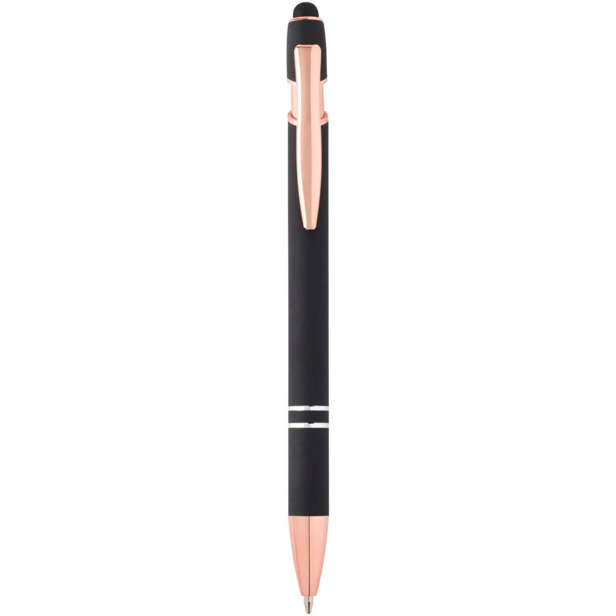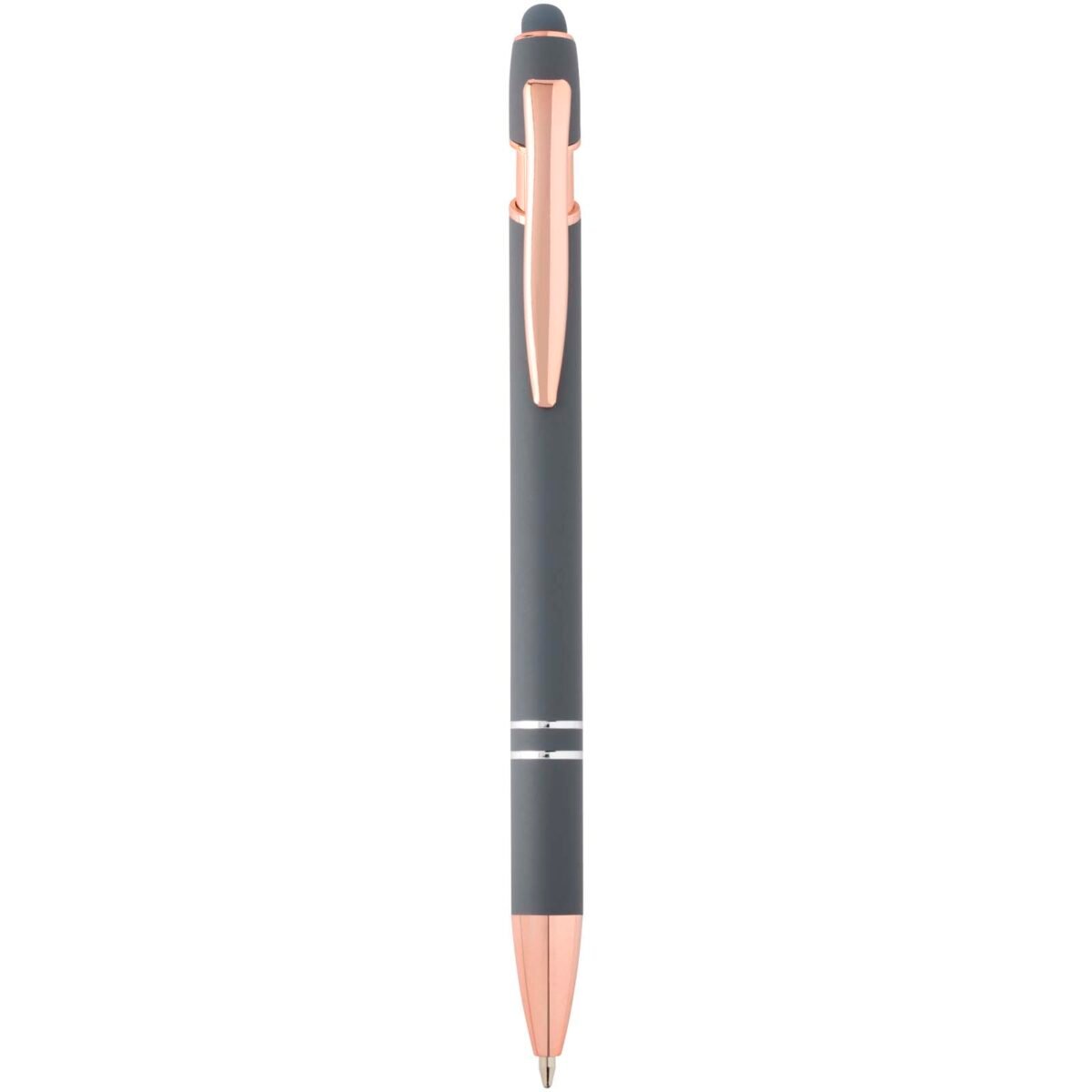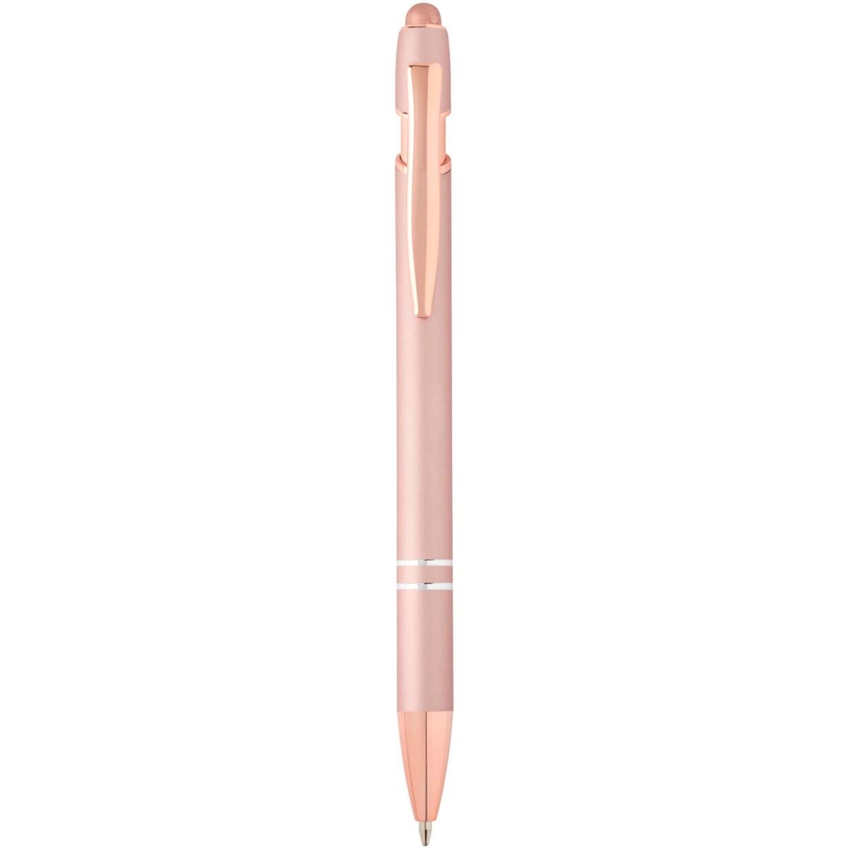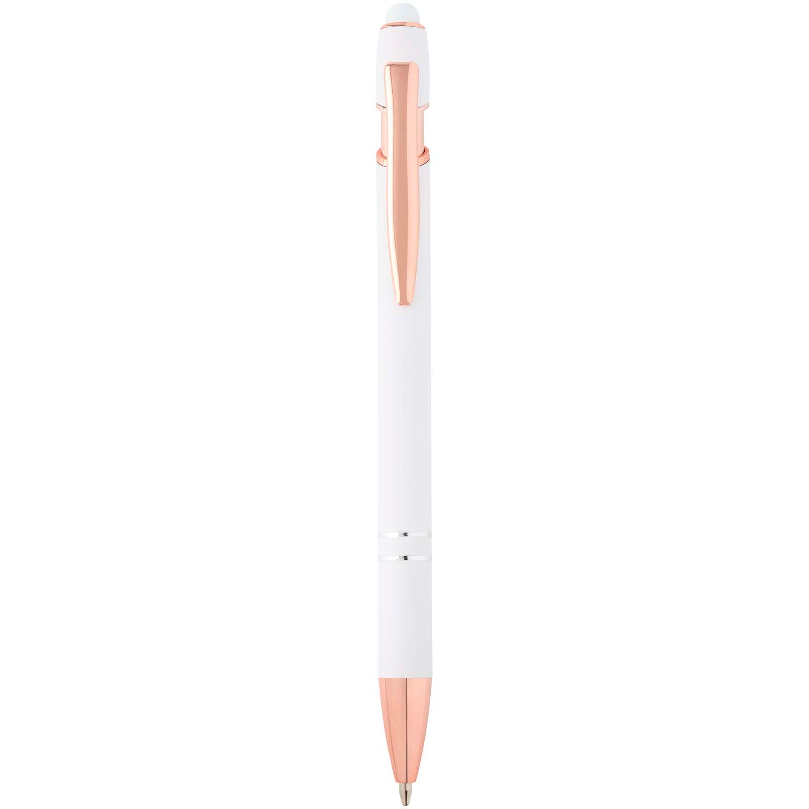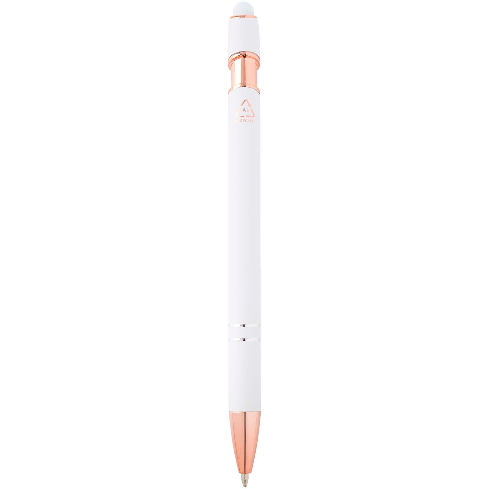 Le stylo bille Nanna avec finition or rose est pourvu d’un corps en aluminium recyclé et d’un stylet tactile en silicone. L’aluminium recyclé réduit également la quantité de déchets dans les décharges et contribue ainsi à la conservation des ressources naturelles, tout en réduisant les émissions de gaz à effet de serre. Couleur de l’encre : Noire. Longueur d’écriture : 800 mètres. Taille de la plume : 1,0 mm.
