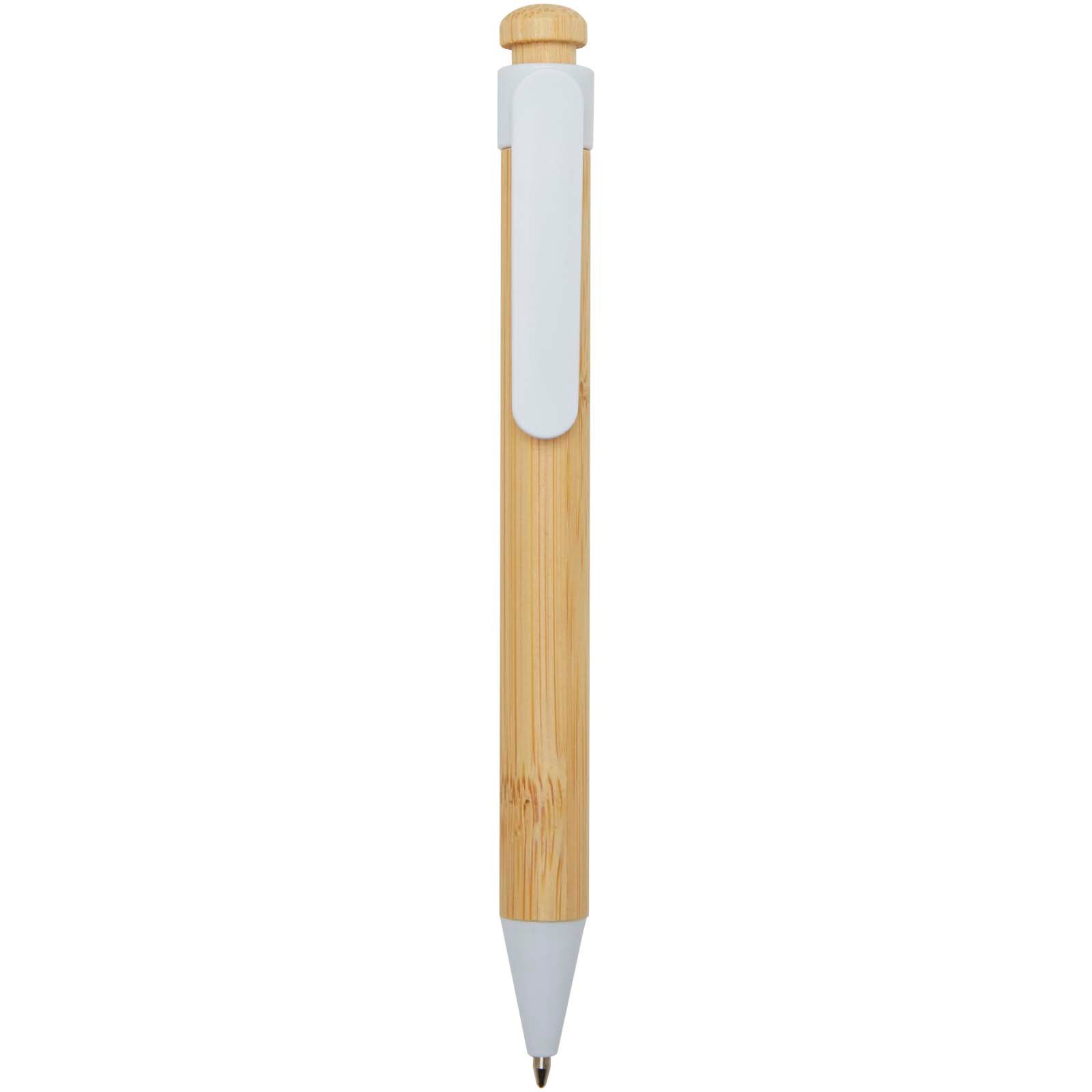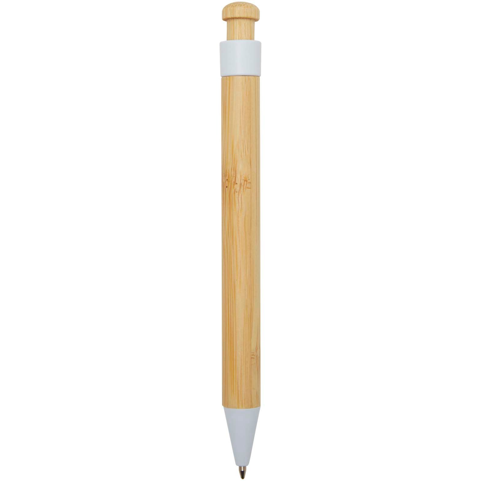 Stylo bille dont le clip et la pointe sont en plastique recyclé, et dont le bouton et le corps sont en bambou. Couleur de l’encre : Noire. Longueur d’écriture : 1000 mètres. Taille de la plume : 1,0 mm.