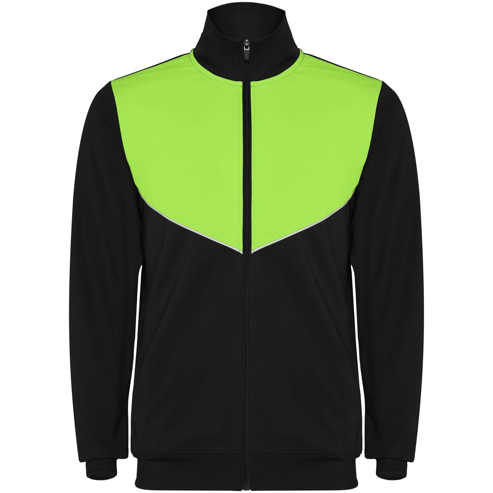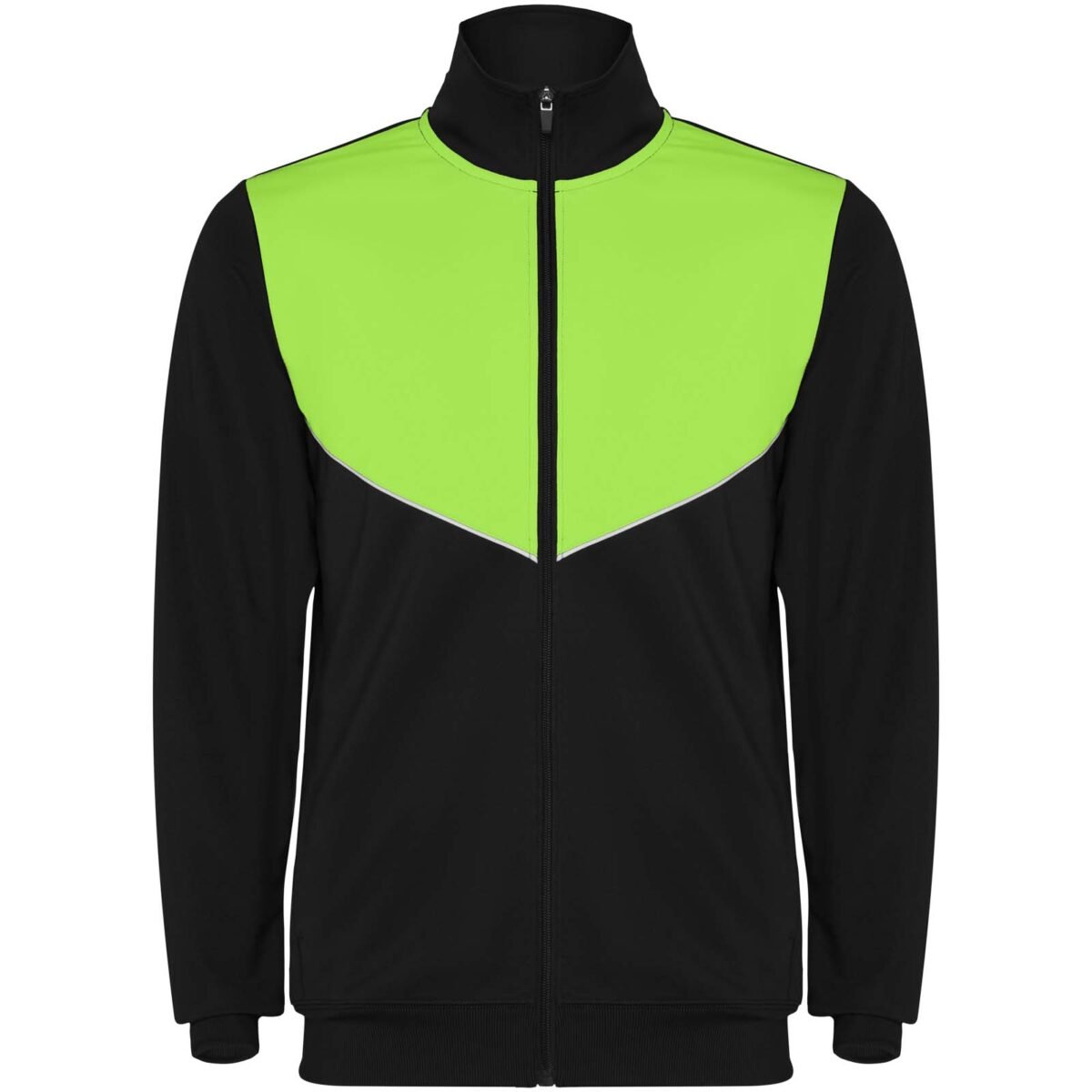 Survêtement en tissu léger et élastique. Veste avec couleur contrastée et finitions cousues sur la poitrine. Col montant avec coutures contrastées. Fermeture à glissière centrale sur le devant. Poches latérales. Poignets et taille côtelés 2×2. Pantalon avec ceinture élastique et cordon de serrage. Pièce latérale contrastée avec finition cousue. Ourlet zippé.