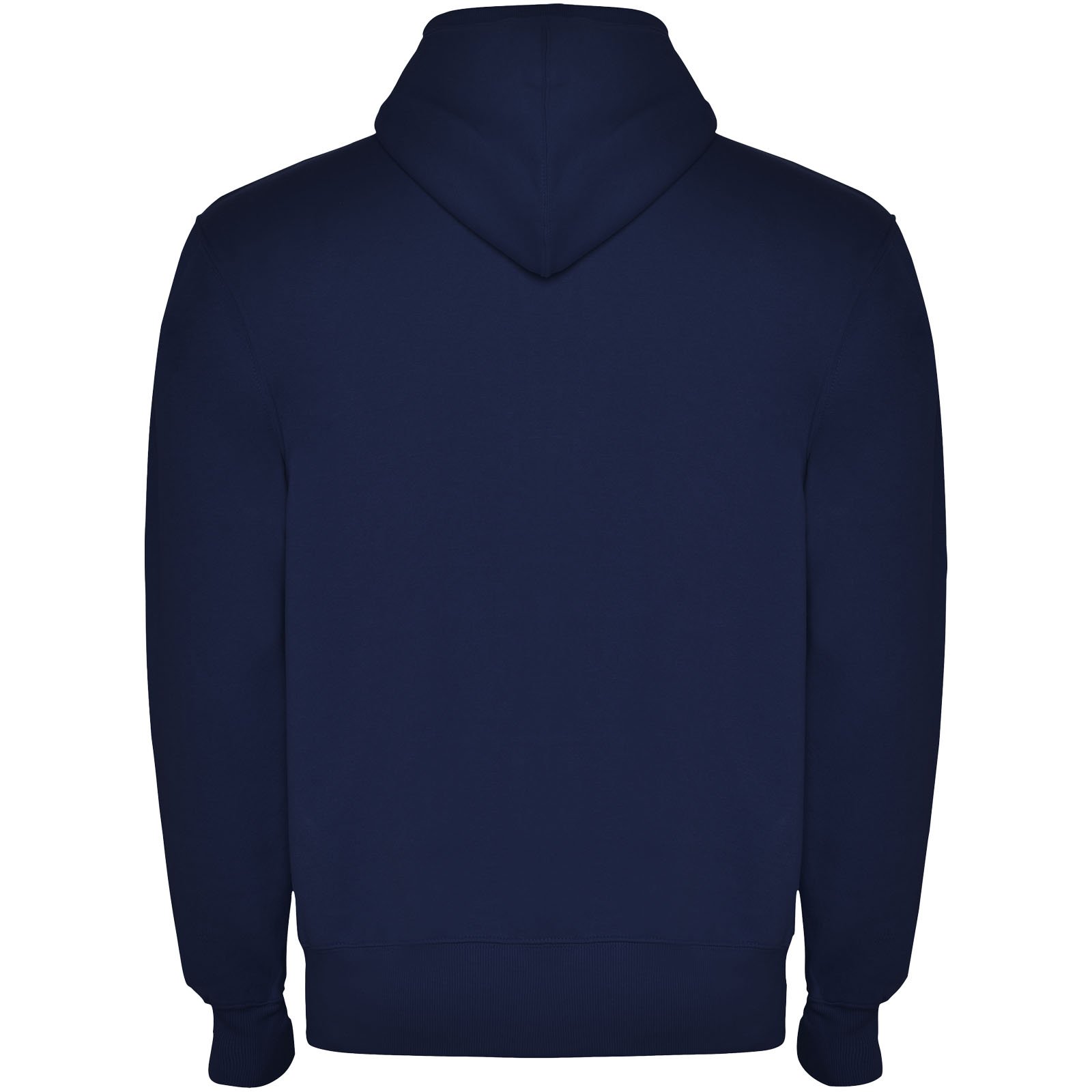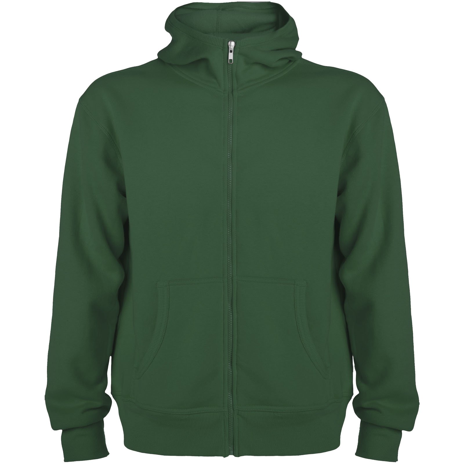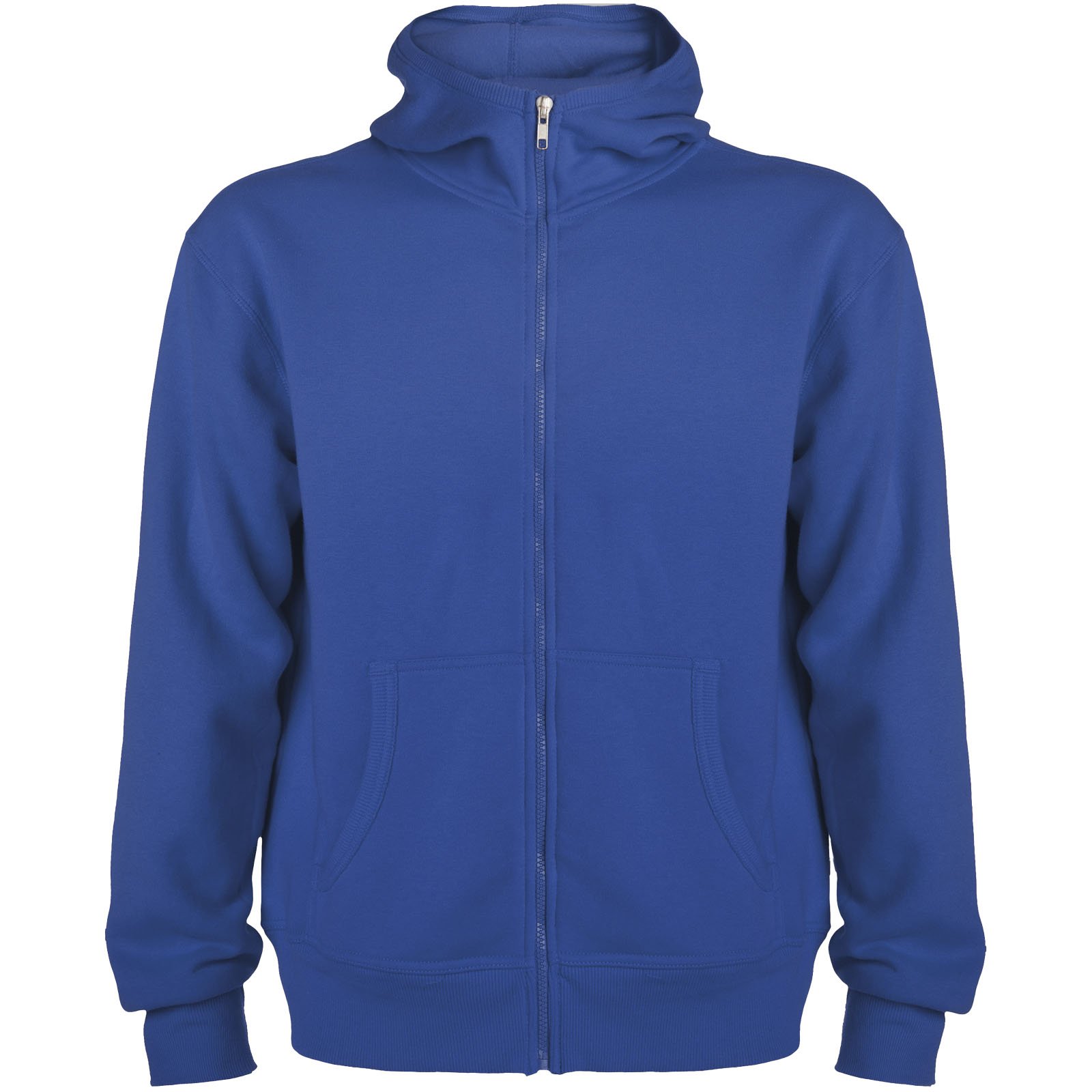 Veste à capuche avec col montant et fermeture éclair complète. Détail côtelé sur la capuche et le passepoil des poches. Poche style kangourou. Côte 2×2 aux poignets et à la taille. Étiquette détachable. Le mannequin mesure 184 cm et porte la taille L.