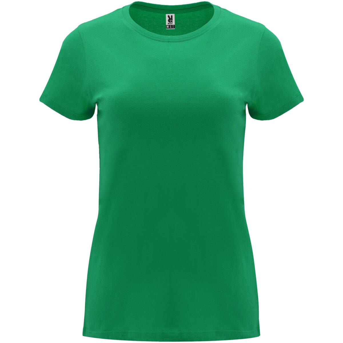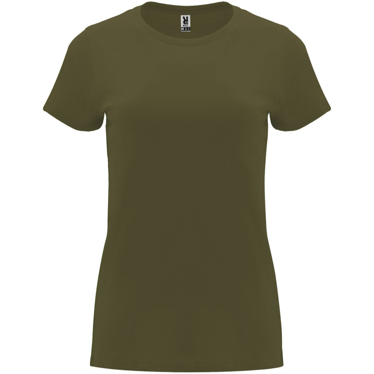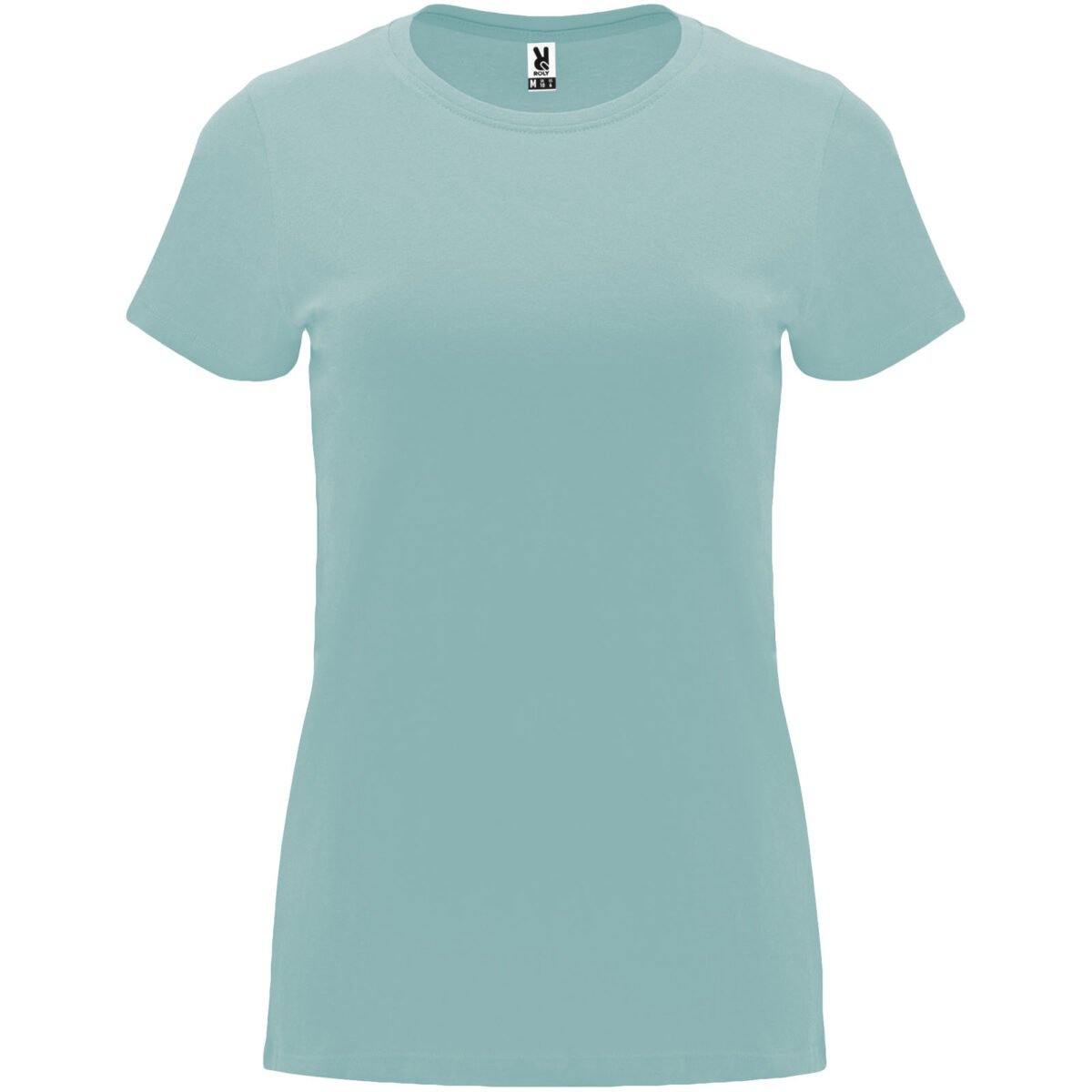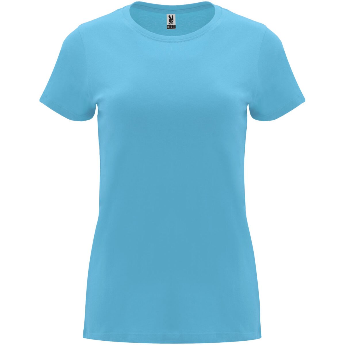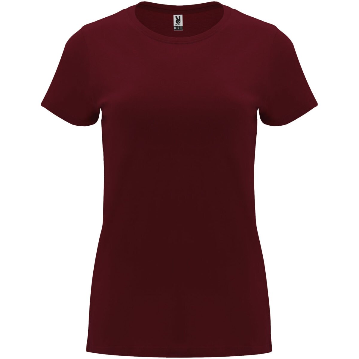 T-shirt ajusté à manches courtes pour femme. Col rond côtelé 1×1. Coutures recouvertes renforcées au col. Étiquette détachable.