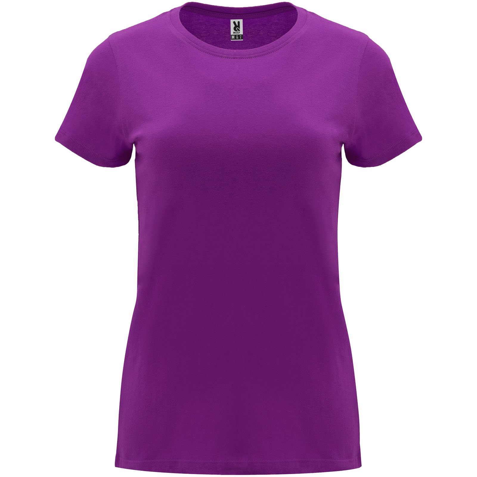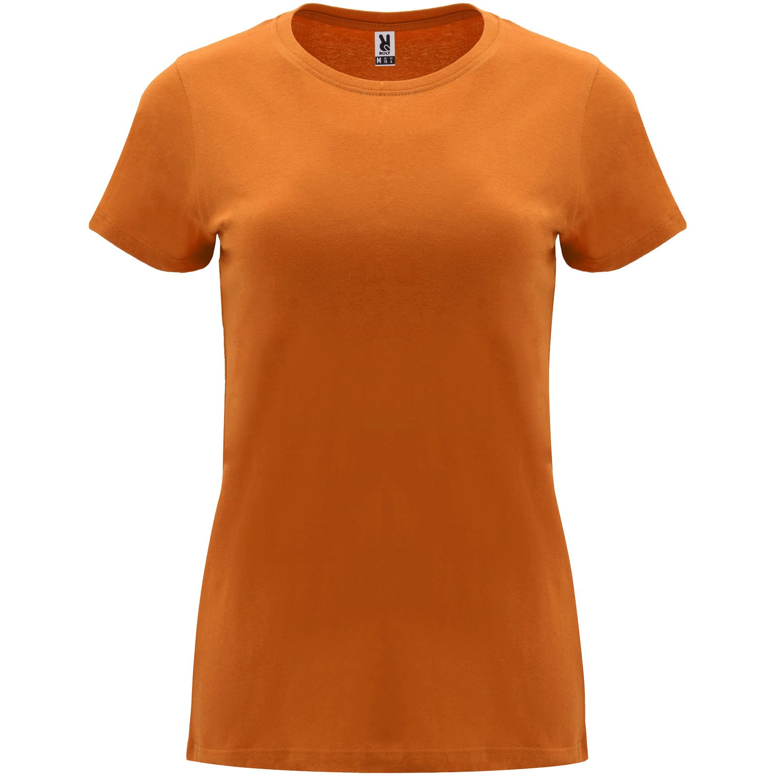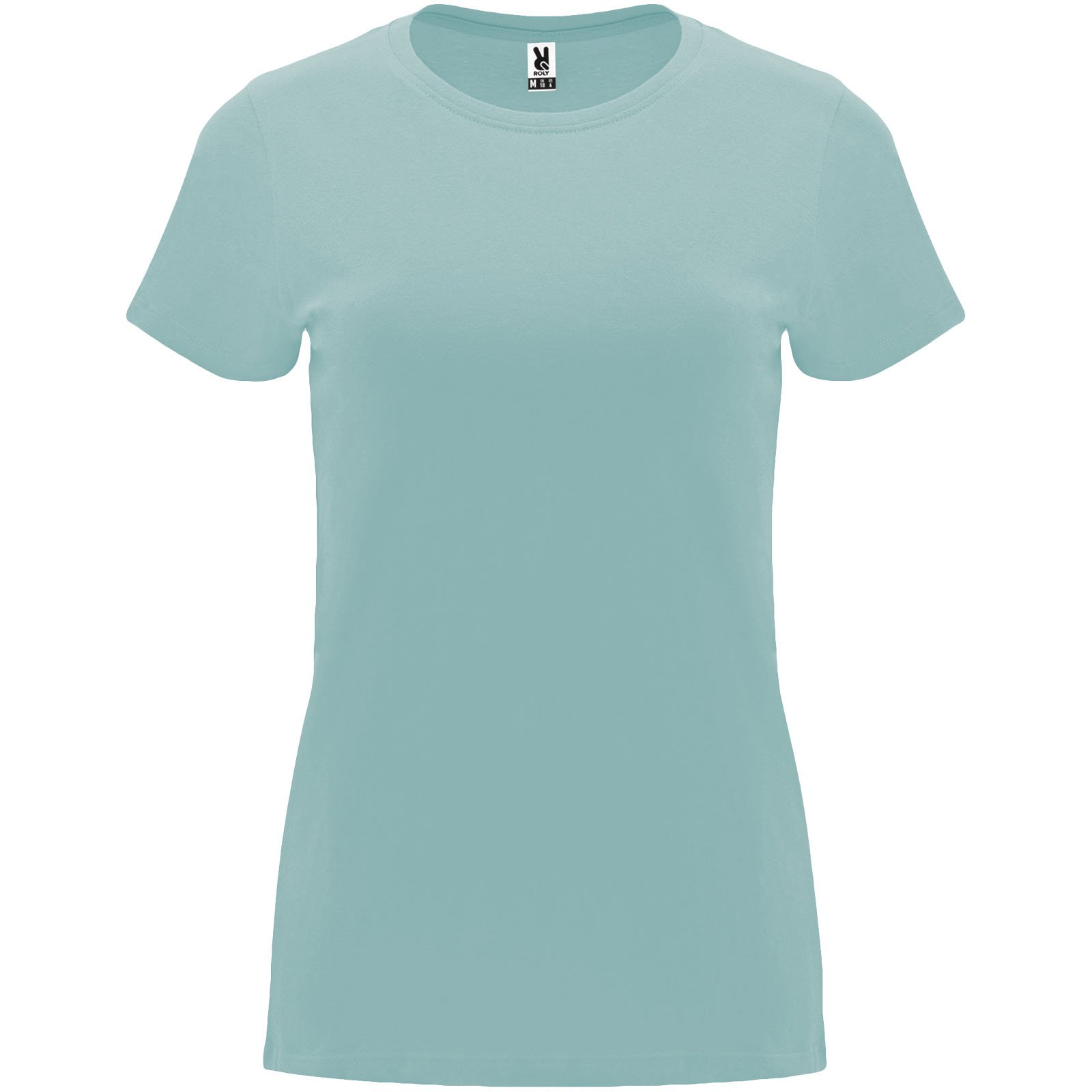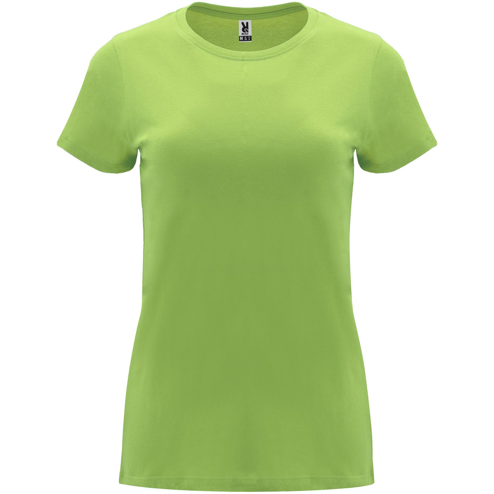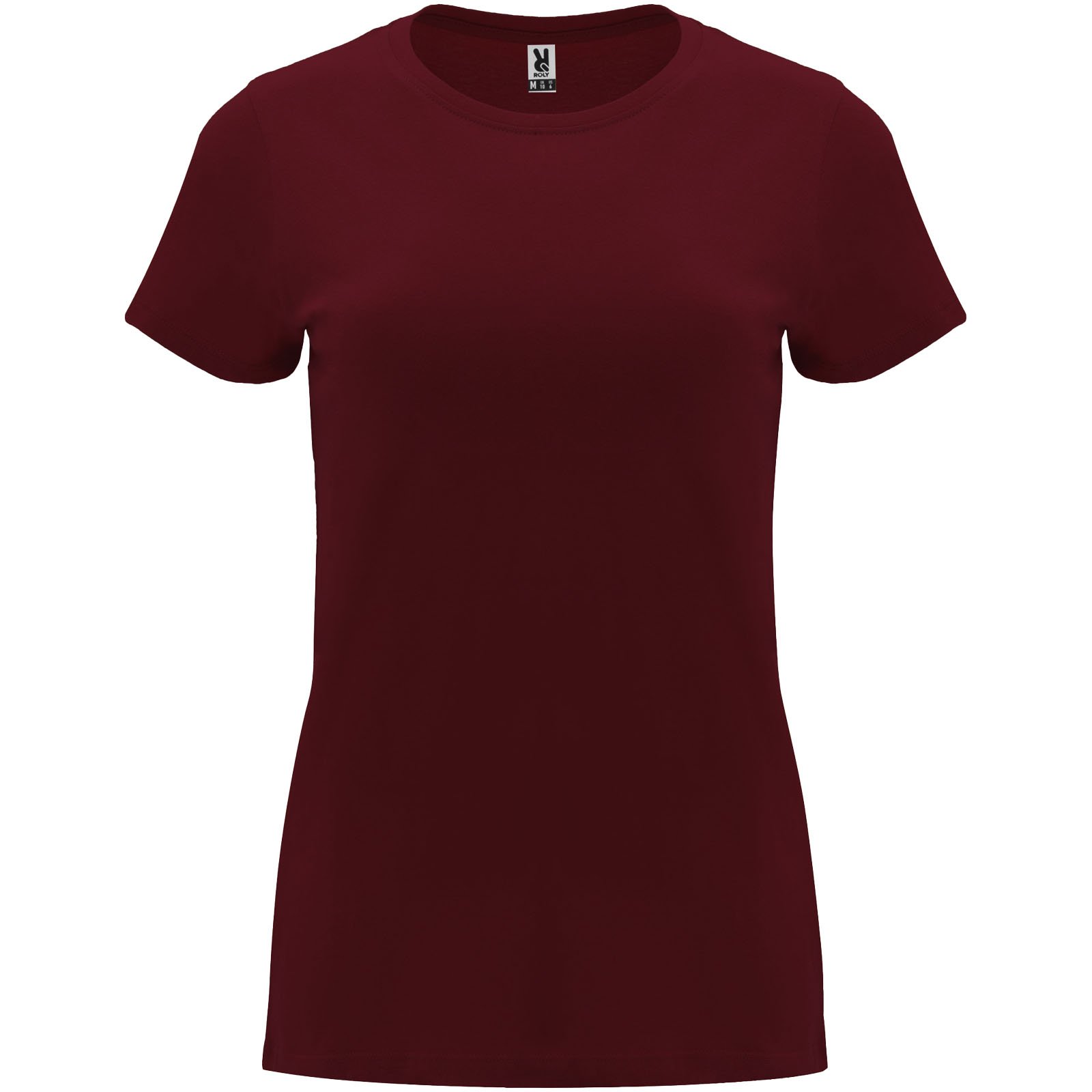 T-shirt ajusté à manches courtes pour femme. Col rond côtelé 1×1. Coutures recouvertes renforcées au col. Étiquette détachable.