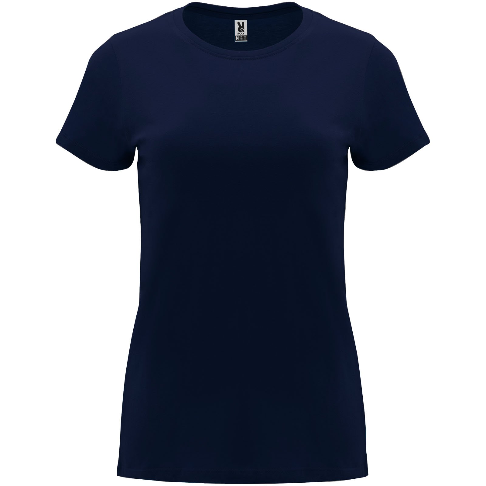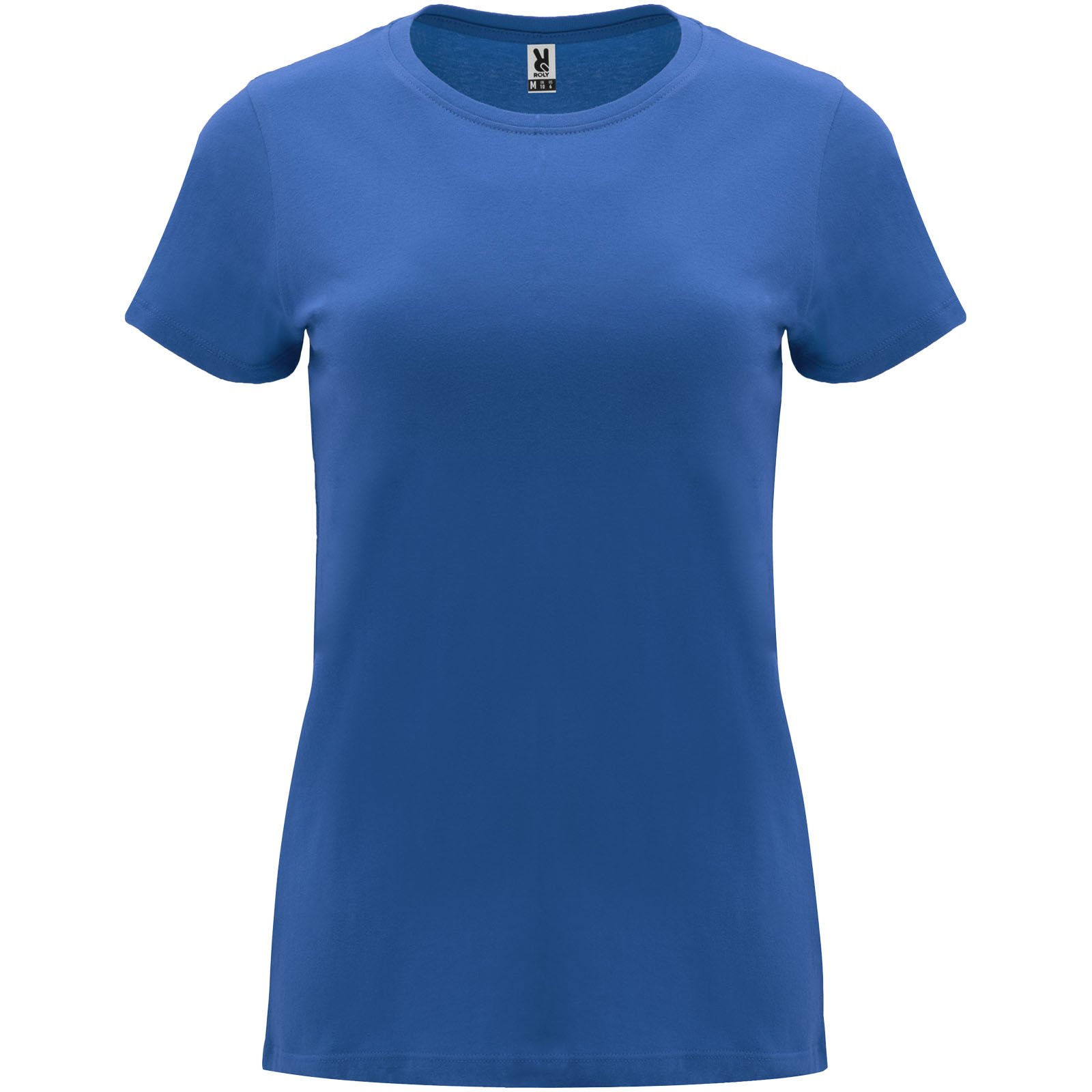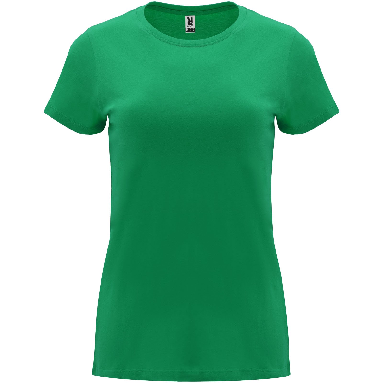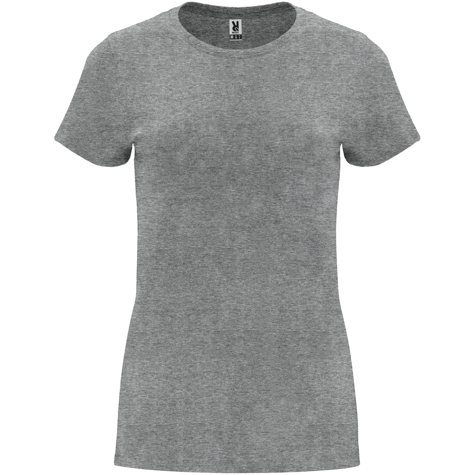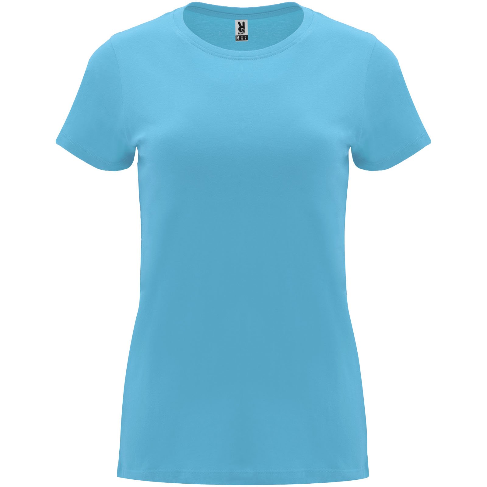 T-shirt ajusté à manches courtes pour femme. Col rond côtelé 1×1. Coutures recouvertes renforcées au col. Étiquette détachable.