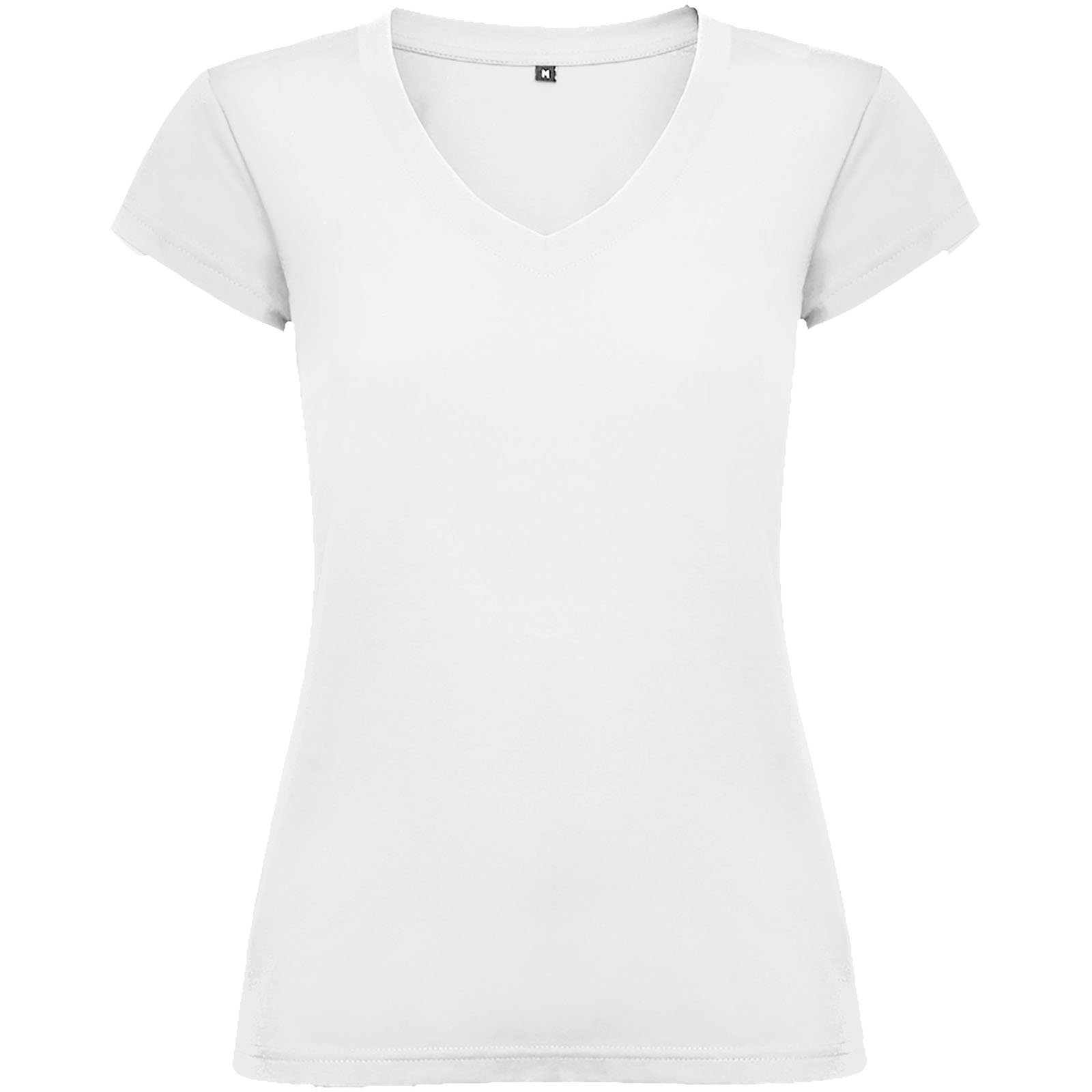 T-shirt col V à manches courtes pour femme avec finitions en côte 1×1. Coupe slim avec coutures latérales. Étiquette détachable. Le mannequin mesure 174 cm et porte la taille S.