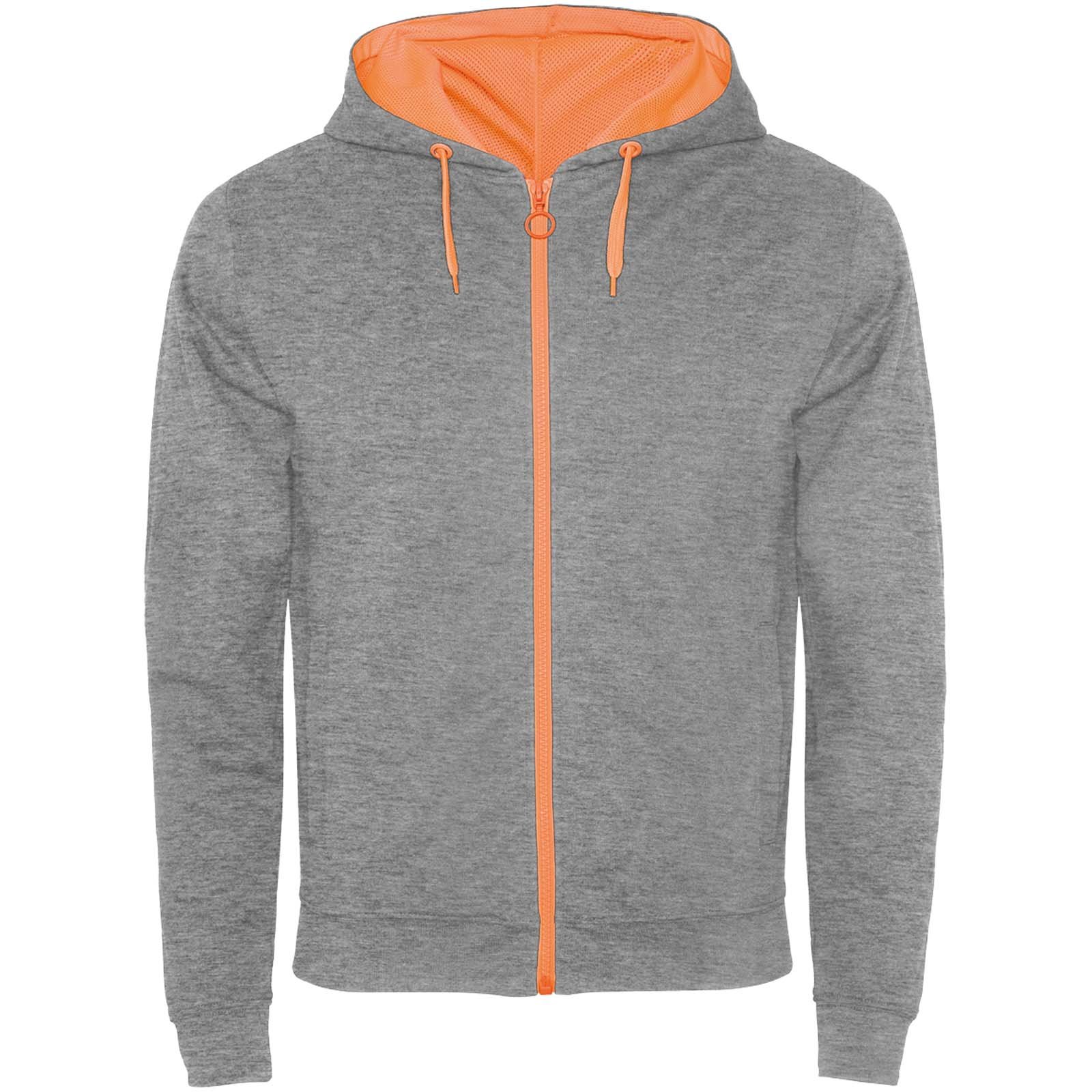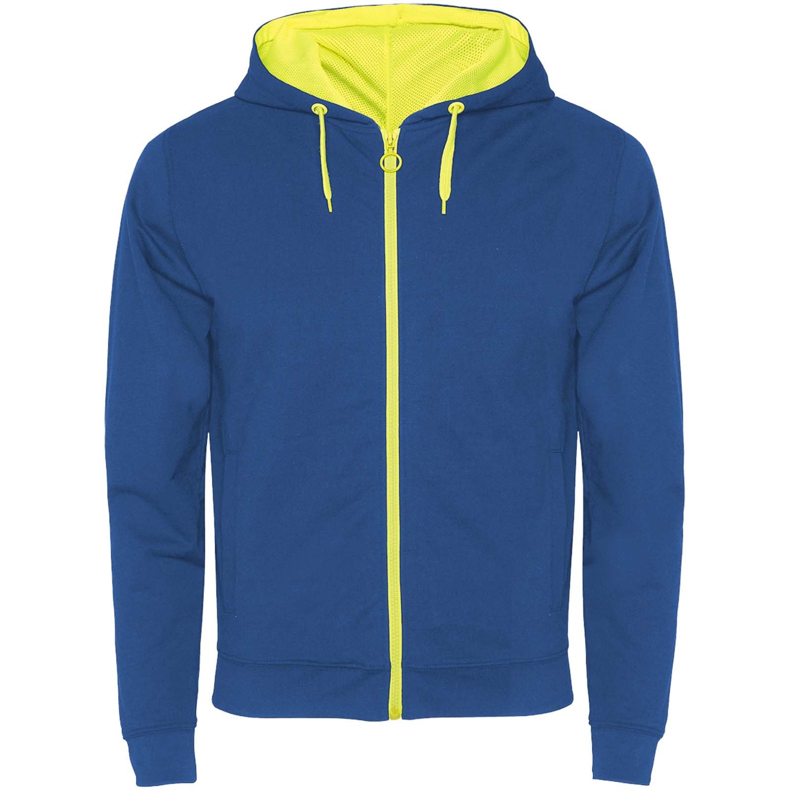 Veste de survêtement en polaire non brossée avec détails en couleur fluo. Fermeture à glissière centrale avec tirette contrastée. Capuche avec doublure en polyester microperforé et couleur fluo contrastée. Cordon de serrage et œillets métalliques en couleur fluo contrastée. Poignets et taille côtelés 1×1. Deux poches avant avec une large bordure. Surpiqûres renforcées au niveau du col intérieur. Étiquette détachable.